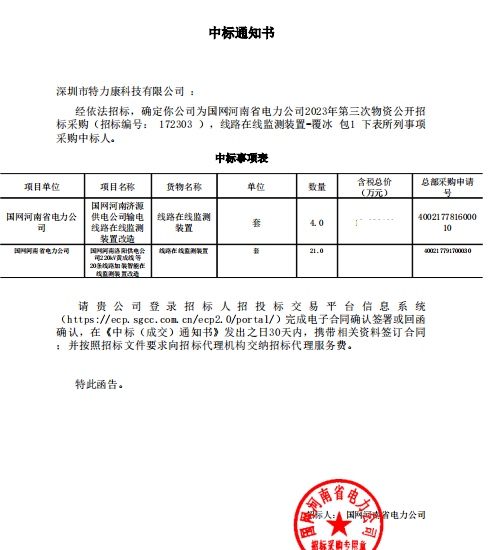 特力康中標(biāo)國網(wǎng)黑龍江送變電工程公司的2024年度第18次物資類競爭性談判采購項目——慶陽驅(qū)鳥器物資框 特力康中標(biāo)國網(wǎng)甘肅省電力公司省管產(chǎn)業(yè)單位2024年第五次物資競爭性談判授權(quán)采購項目 中標(biāo)喜訊:深圳市特力康科技有限公司成功入圍許繼集團(tuán)綜合能源公司輸電線路視頻在線監(jiān)測裝置模塊集采項目 中標(biāo)喜訊:特力康成功中標(biāo)國網(wǎng)重慶市電力公司渝中一片區(qū)項目 特力康成功中標(biāo)國網(wǎng)天津市電力公司2024年第二次?物?資招標(biāo)項目 特力康中標(biāo)國網(wǎng)安徽省電力有限公司蕪湖供電公司2024年3月非物質(zhì)采購項目 貴州電力裝特力康電網(wǎng)架空線路覆冰監(jiān)測系統(tǒng),精準(zhǔn)防冰保電網(wǎng)過冬? 百套落地山西電網(wǎng)!特力康輕量化輸電架空線路監(jiān)拍裝置,筑牢輸電安全網(wǎng) 破解采空區(qū)隱患:山西電力裝特力康通用型監(jiān)測裝置,守鐵塔穩(wěn)運行 四川電力用特力康架空輸電線路山火監(jiān)測裝置,筑牢林區(qū)輸電 “防火墻”? 遼寧電力啟用特力康多視角監(jiān)拍裝置,全維度守護(hù)輸電安全? 破解黃土高原沉降難題:山西電力用特力康北斗裝置守桿塔安全? 山東電力啟用特力康動態(tài)版智能激光驅(qū)鳥器,動態(tài)防控守護(hù)變電站安全? 湖南超高壓電力啟用特力康球機(jī) AI 監(jiān)測裝置,智能守護(hù)輸電通道安全? 廣西電力啟用特力康高壓電纜護(hù)層環(huán)流監(jiān)控設(shè)備,筑牢電纜安全防線? 寧夏配電線路安裝了我司防外破電子化智能警示牌