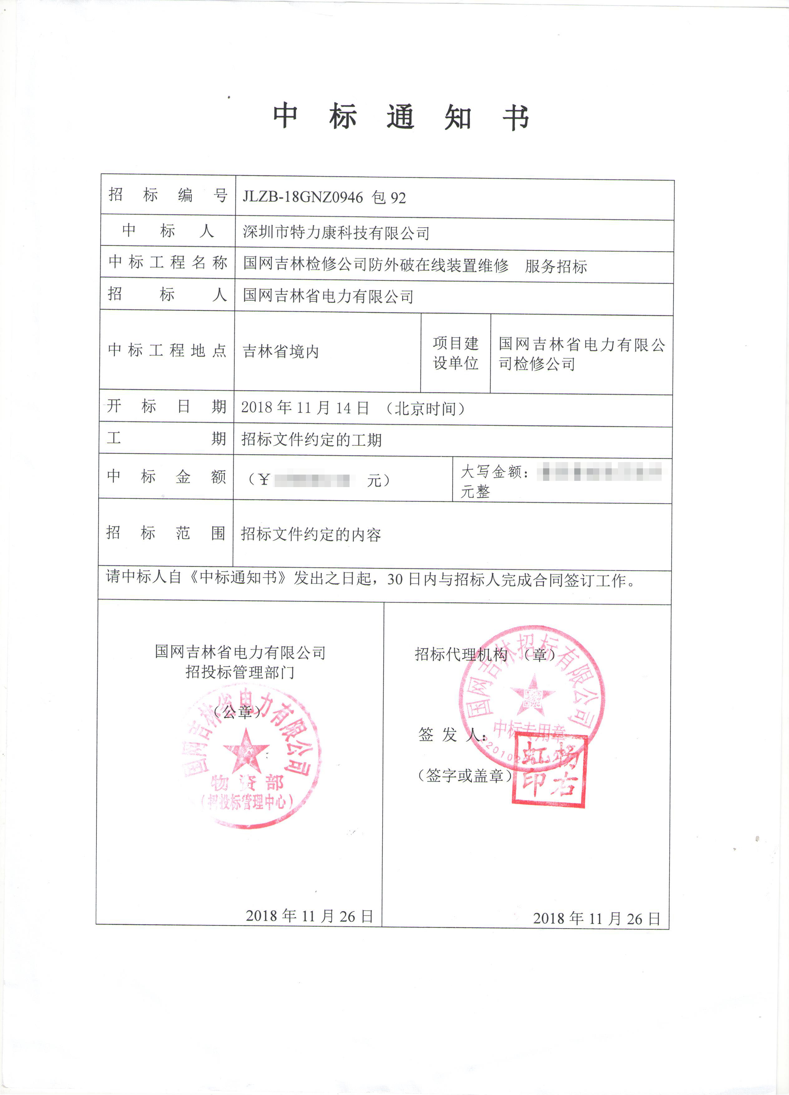 國(guó)網(wǎng)吉林省電力公司防外破裝置項(xiàng)目采購(gòu)項(xiàng)目評(píng)審工作已結(jié)束,經(jīng)評(píng)審委員會(huì)評(píng)審,經(jīng)國(guó)網(wǎng)吉林省電力公司招投標(biāo)領(lǐng)導(dǎo)小組批準(zhǔn),將評(píng)審結(jié)果公示。我司被確定為中標(biāo)單位現(xiàn)將公告公示。