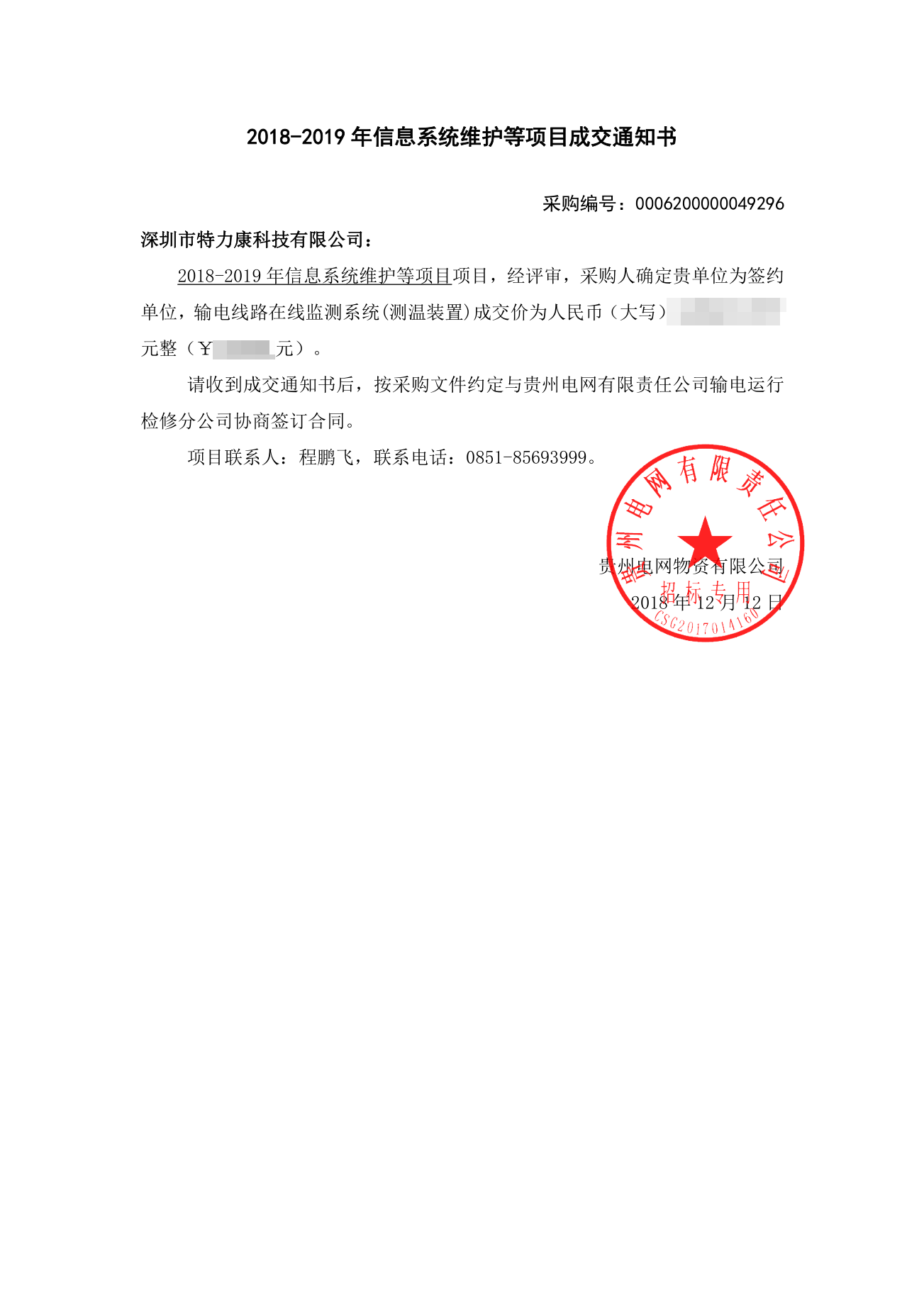 我司中標貴州省電力公司2018-2019信息系統維護項目