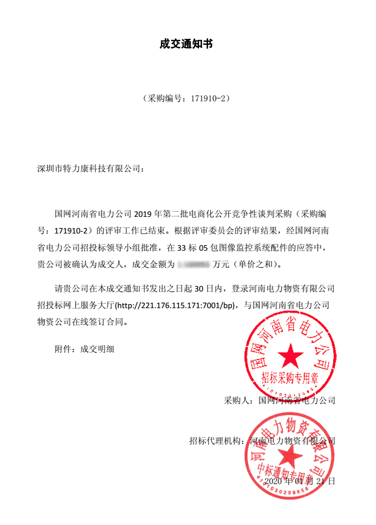 國網(wǎng)河南省電力公司2019年第二批電商化公開競爭性談判采購(采購編號: 171910-2) 談判工作已結束,經(jīng)評審委員會評審,并報公司招投標工作領導小組批準,我司中標國網(wǎng)河南省電力公司2019年第二批電商化公開競爭性談判采購33標05包圖像監(jiān)控系統(tǒng)配件及34標03包圖像監(jiān)控系統(tǒng)接口板,中標通知如下: