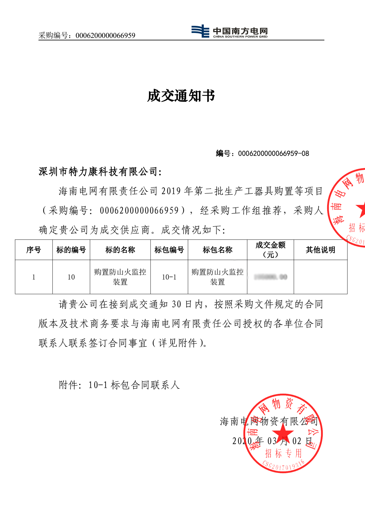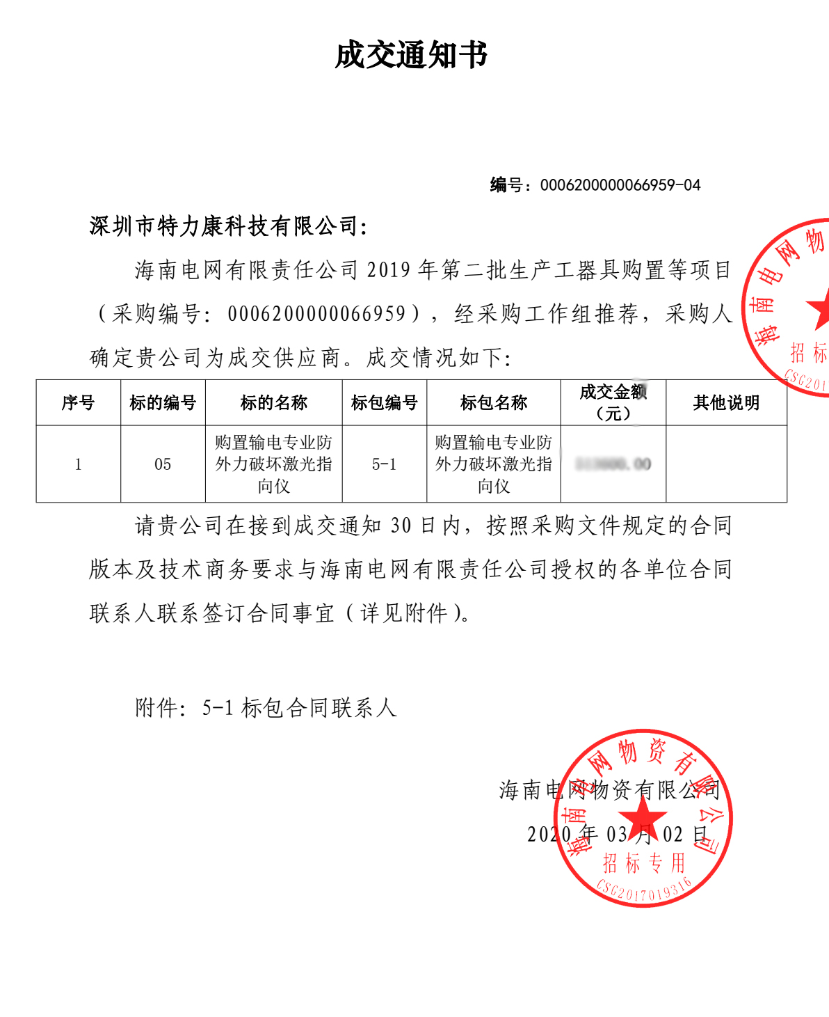 海南電網有限責任公司2019年第二批生產工器具購等項目(采購編號; 0000660509 )采購工作已完成。經采購工作組推薦,采購人確定我司(深圳市特力康科技有限公司)成為本此標包5-1購置輸電專業防外力破壞激光指向儀及標包10-1購置防山火監控裝置的成交供應商,附成交通知書如下: