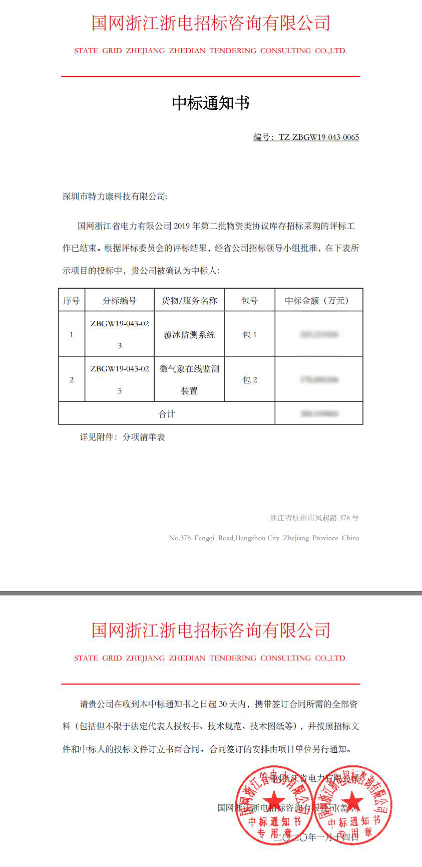 國網浙江省電力有限公司2019年第二批物資類協議庫存招標采購的評標工作已結束。根據評標委員會的評標結果,經省公司招標領導小組批準,我司(深圳市特力康科技有限公司)中標ZBGW19-043-023覆冰監測系統包1及ZBGW19-043-025微氣象在線監測包2兩個標包,現附中標通知書如下: