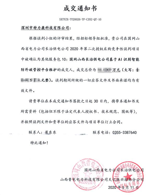 根據談判小組的評審結果,經招標領導組批準,我司(深圳市特力康科技有限公司)在國網山西省電力公司長治供電公司2020年第二次授權采購競爭性談判項目中被確認為其他服務包10:國網山西長治供電公司基于AI識別智能防外破管控平臺維護的成交人。現附中標通知書如下: