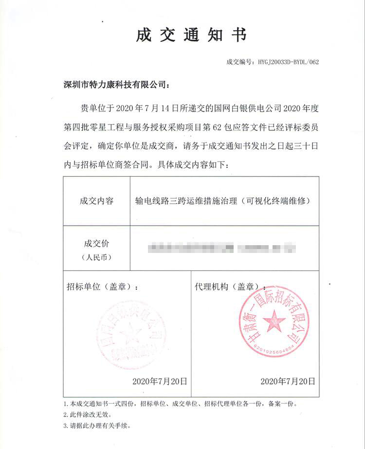 我司于2020年7月14日參加了國網(wǎng)白銀供電公司2020年度第四批零星工程與服務(wù)授權(quán)采購項目第62包輸電線路三跨運維措施治理(可視化終端維修)的投標(biāo)工作,所遞交的應(yīng)答文件經(jīng)評標(biāo)委員會評定,確定我司(深圳市特力康科技有限公司)是成交商,具體成交內(nèi)容如下: