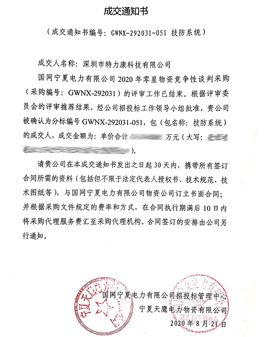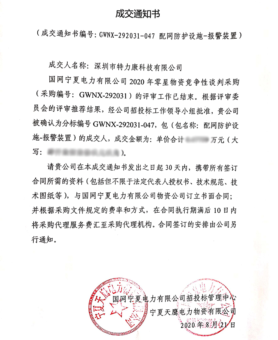 國網(wǎng)寧夏電力有限公司2020年零星物資競爭性談判采購(采購編號: GWNX-292031)的評審工作已結(jié)束。根據(jù)評審委員會的評審?fù)扑]結(jié)果,經(jīng)招投標(biāo)工作領(lǐng)導(dǎo)小組批準(zhǔn),我司(深圳市特力康科技有限公司)被確認為分標(biāo)編號GWNX-292031-047,包(包名稱:配網(wǎng)防護設(shè)施-報警裝置)及分標(biāo)編號GWNX-292031-051,包(包名稱:技防系統(tǒng))的成交人,現(xiàn)發(fā)布成交通知書如下: