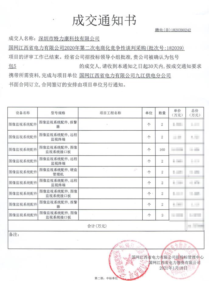 國(guó)網(wǎng)江西省電力有限公司2020年第二次電商化競(jìng)爭(zhēng)性談判采購(gòu)(批次號(hào):182039)項(xiàng)目的評(píng)審工作已結(jié)束。經(jīng)省公司招投標(biāo)領(lǐng)導(dǎo)小組批準(zhǔn),我司(深圳市特力康科技有限公司)被確認(rèn)為包號(hào)包5(圖像監(jiān)視系統(tǒng)配件)的成交人,成交通知如下: