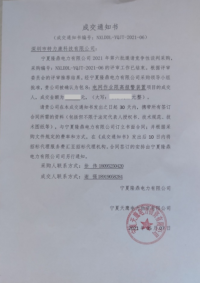寧夏隆鼎電力有限公司2021年第六批邀請競爭性談判采購,采購編號: NXLDDL-YQJT -2021-06的評審工作已結束。根據評審委員會的評審推薦結果,經寧夏隆鼎電力有限公司采購領導小組批準,我司被確認為包8:電網作業限高報警裝置項目的成交人,中標通知如下: