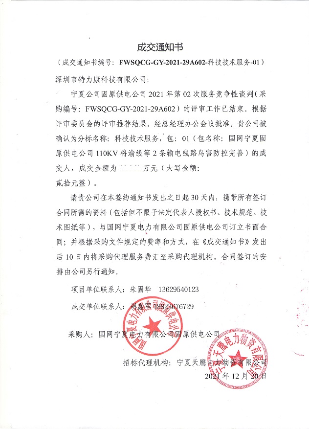 寧夏公司固原供電公司2021年第02次服務競爭性談判(采購編號: FWSQCG-GY-2021-29A602) 的評審工作已結束。根據評審委員會的評審推薦結果,經總經理辦公會議批準,貴公司被確認為分標名稱:科技技術服務,包: 01 (包名稱:國網寧夏固原供電公司110KV將渝線等2條輸電線路鳥害防控完善)的成交人,成交通知如下: