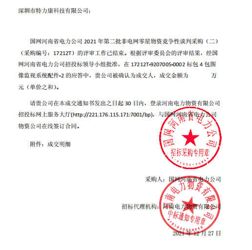 國網河南省電力公司2021年第二批非電網零星物資競爭性談判采購(二)(采購編號: 17212T) 的評審工作已結束。根據評審委員會的評審結果。經國網河南省電力公司招投標領導小組批準,在172127-9207005-0002標包4包圖像監視系統配件-2的應答中。貴公司被確認為成交人,成交通知如下: