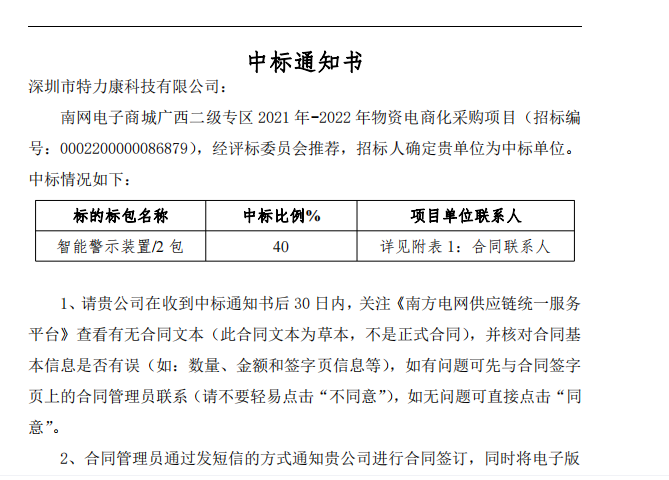 我司中標南網(wǎng)電子商城廣西二級專區(qū)2021年-2022年物資電商化采購項目(招標編號: 0020000086879) - 智能警示裝置,經(jīng)評標委員會推薦,招標人確定我單位為中標單位。中標情況如下: