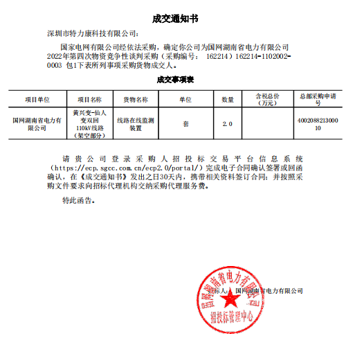 深圳市特力康科技有限公司:國家電網有限公司經依法采購,確定你公司為國網湖南省電力有限公司2022年第四次物資競爭性談判采購(采購編號: 162214) 162214-1102002-0003包1下表所列事項采購貨物成交人。中標通知如下: